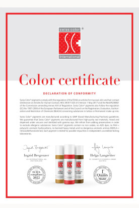 Käytössäni on korkealuokkaiset, laadukkaat ja REACH-asetuksen mukaiset Swiss Color kestopigmentointivärit. Swiss Color väreissä ei ole rautaoksideja, vaarallisia atso-värejä, PAH- yhdisteitä (Polysykliset aromaattiset hiilivedyt), kiellettyjä raskasmetalleja tai vaarallisia aromaattisia amiineja kuten NDELA.